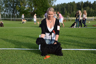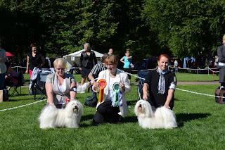 Lauantaina lämpötila oli "vain" +25 astetta, joka oli oikein sopiva meille. Odessa oli aamulla ensimmäisenä kehässä ja jännitin todella paljon Odessan kehää. Tuomarina oli tiukka Henric Fryckstrand, Ruotsista. Odessa sai oikein hyvän arvostelun, lupaava juniori :) Odessa sai siis toisen luokka-sertin, oli jälleen ROP-jun sekä ROP. Havaneesit arvosteli lauantaina Cecik Ratibor, Serbiasta. Mimosa veti tänäänkin nartuissa pisimmän korren, ollen paras narttu. Viola sijoittui valioluokassa toiseksi ja paras narttu kisassa kolmanneksi. Vaca meni kauniille nuorelle nartulle Zeralda's Jazz Love:lle, onnea Maija ja Petra! Notte oli tänään ROP, valmistui Liettuan valioksi ja Väinö taas vuorostaan pu2 vaca:n kera joka vahvistuu cacibiksi, jee! Isoissa kehissä Viola ja Notte osallistuivat parikisaan, tuomarina toimi Henric Fryckstrand joka otti meidät heti jatkoon ja sijoitti lopuksi vielä BIS2-pariksi! 9-ryhmän arvosteli Laurent Heinesche, joka poimi upeasti esiintyvän Noten ryhmässä 6. parhaan joukkoo, sijoitusta ei kuitenkaan tullut.