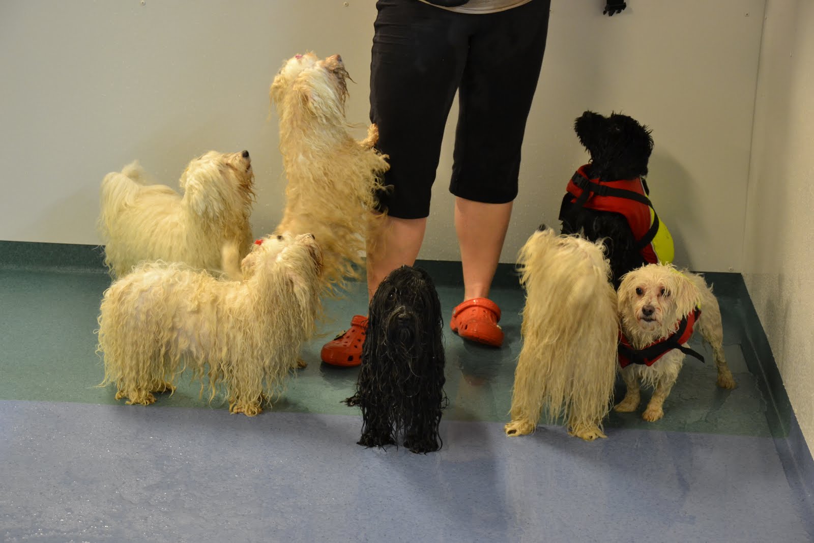 Kävimme perjantaina 13.1 tutustumassa ensimmäistä kertaa Helsingin koirauimalaan, joka avattiin ennen joulua. Altaat ovat vähän pienemmät kuin Hyvinkäällä, mutta sopivat meille. Merry oli taas kuin elementissään vesipetona ja nouti lelua innoissaan. Mindy innostui myös uimisesta. Mimosa joutui "uittamaan" ja Viola taas ei tassujaan kastellut. Herrasmies-seura Notte ja Väinö uivat rauhallisesti ja innokkaasti :) Myös Odessa kokeili ensi kertaa uintia ja taitaa meidän vesikoiran alusta tulla kunnon vesipeto :)
