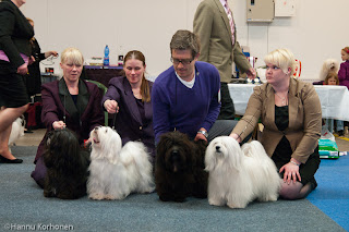 Havannalaisten erikoisnäyttely järjestettiin tänä vuonna Lohjalla. Havaneeseja oli ilmoitettu huikeat 133 koiraa kehään, monen kirjavaa sakkia olikin kehissä :) Kotoa meiltä lähti kehään pitkän tauon jälkeen vain Mimosa, Viola ei vielä ihan ole turkissaan kehiin. Tuomarina nartuilla oli Torbjörn Skaar, Ruotsi ja uroksilla Per Svarstad, Ruotsi.