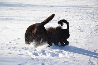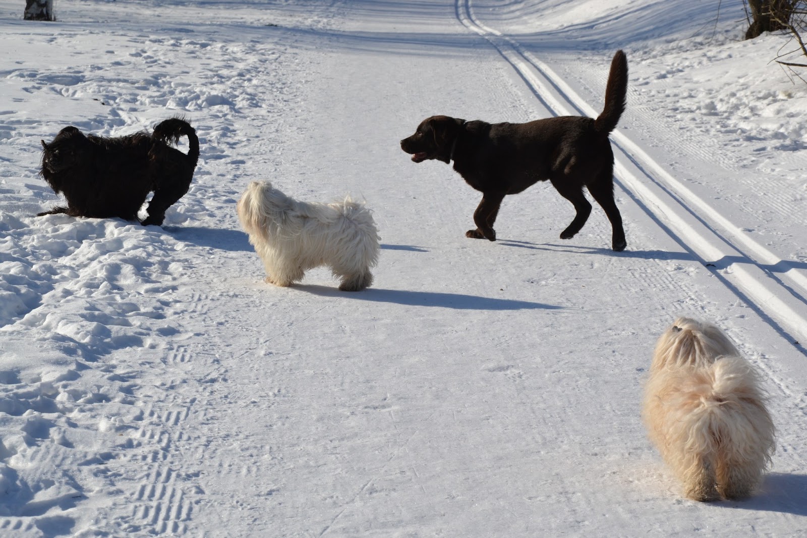Torstai aamulle ennen iltavuoroa oltiin sovittu labradorinnoutaja Kapon omistajan kanssa ulkoilutreffit. Odessa pääsi juoksemaan ja riehumaan sopivan kokoisen kaverinsa kanssa ja pikku koirat saivat myös juoksennella mukana. Koirat jäivät haukotellen iltapäiväksi kotiin, kun minä lähdin töihin.