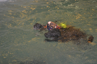 Pitkästä aikaa kävimme Helsingin koirauimalassa. Pikku koirat jäivät kotiin tällä kertaa ja uimalaan polskimaan pääsi vain Odessa. Pitää viedä pienempi porukka toisen kerran uimalaan, tekisi taas hyvää veteraaneillekin. Seurana meillä oli staffit Lulubelle ja Rhino, kiitos Heidille seurasta. Odessa ei ollut aikaisemmin staffi-kaksikkoa tavannutkaan, mutta oli samantien kaveria niiden kanssa. Samanlainen hyppää altaaseen, jyrää muita ja revi lelua meininki yhdisti porukkaa hyvin. Olin oikein yllättänyt miten reipas Odessa oli samantien staffien kanssa.