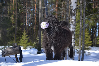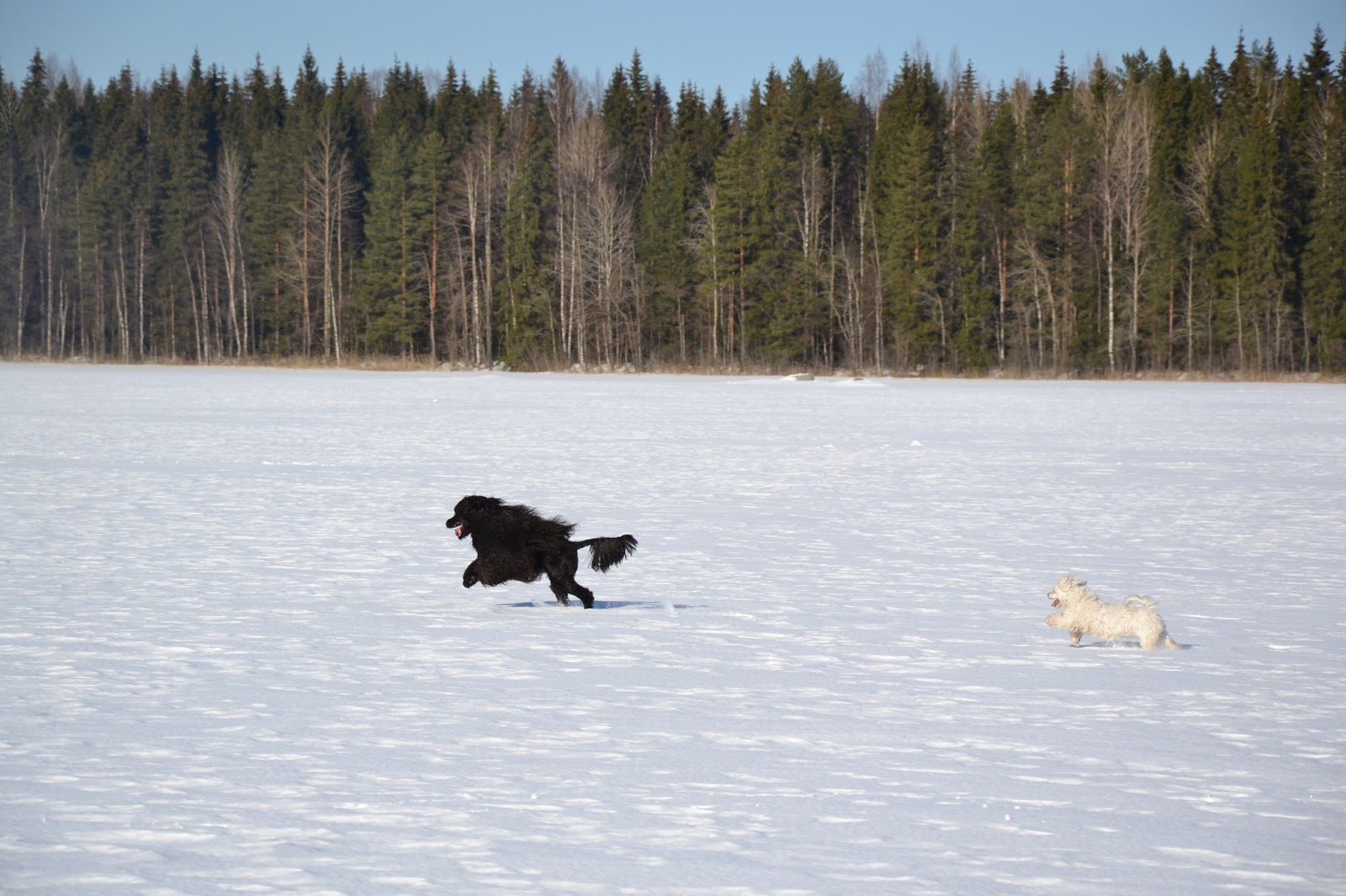 Pääsiäisestä aloitettiin talviloma, suunnattiin lauantaina Kangasniemelle ja tiistai-iltana Anjalankoskelle. Kangasniemellä saimme nauttia ihanista ulkoilusäistä ja koirat pääsivät monta kertaa juoksemaan järven jäälle. Odessa kävi aamuvirkkujen kanssa pitkän aamulenkin, oli mukana päivisin pilkkijöiden matkassa ja vielä iltalenkkiä jäälle. Kyllä oli portugeesi väsähtänyt iltaisin.